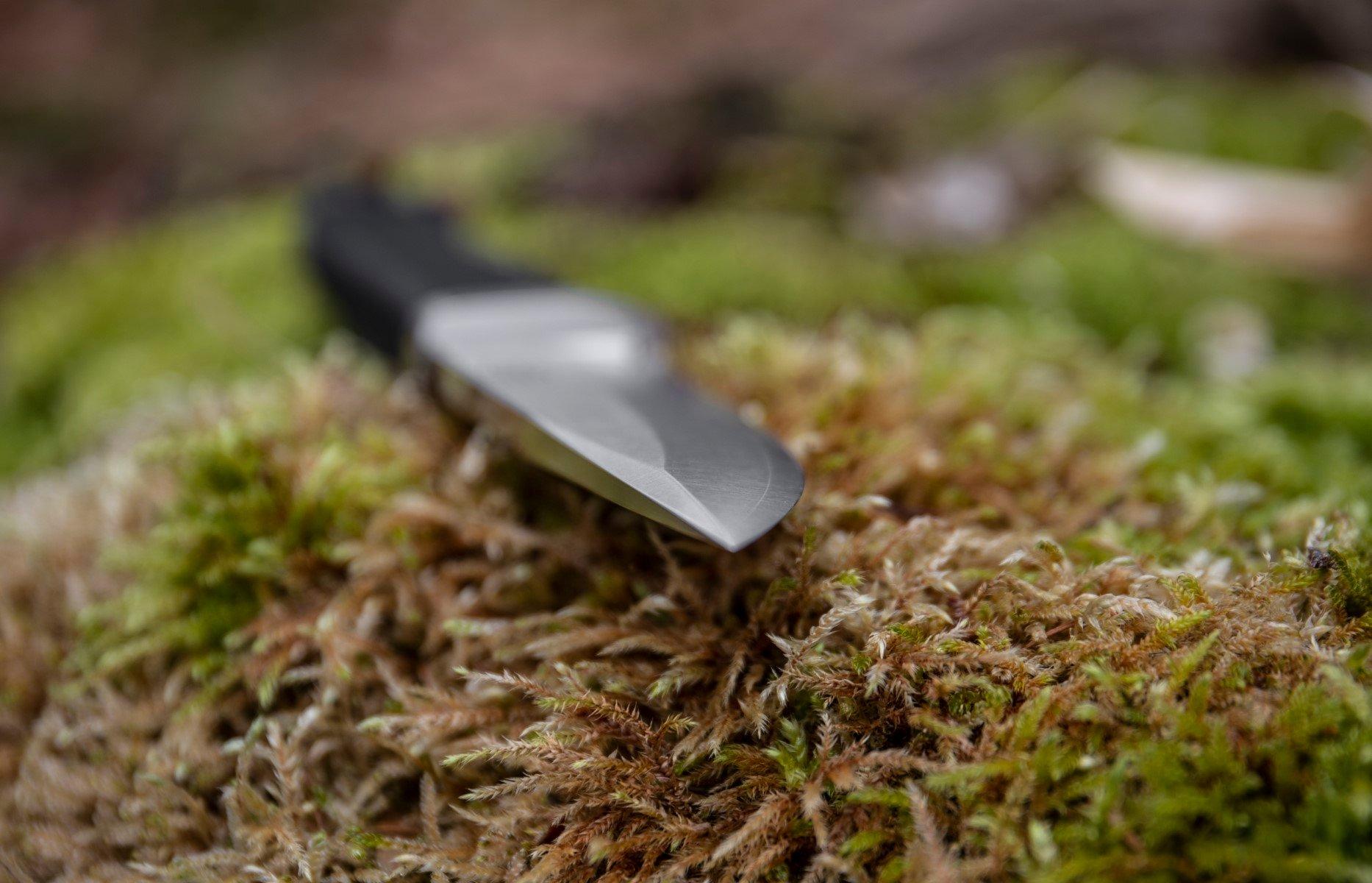 Fällkniven a choisi de doter ses lames d’une émouture convexe. La lame n’est ni plate ni creuse mais bombée. Cela parait être un inconvénient mais détrompez vous. Une lame convexe n’a pas d’angle secondaire. L’aiguisage se profile du dos au fil de la lame. Il n’y a donc pas d’angle derrière le fil entrainant une résistance lors de la coupe, le tranchant est même très fort.